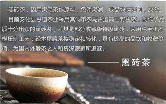 一級(jí)黑毛茶壓制而成, 外形色澤烏潤(rùn),內(nèi)質(zhì)香氣清香,滋味濃厚,湯色橙黃,葉底黃褐。